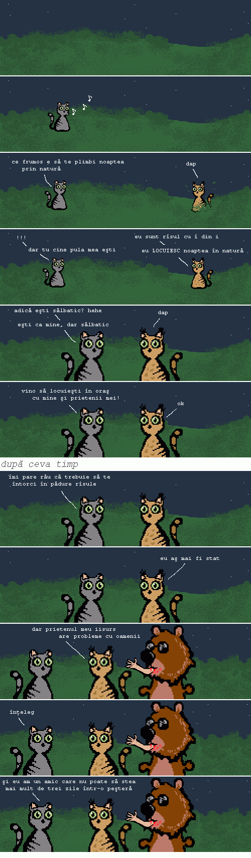 Prin urmare e o tâmpenie să zici “mor de râs” pentru că râsul face miau, nu mor. Mor face ursul. Voi n-aveţi de unde să ştiţi acest lucru da’ mie mi-a spus cineva care a ieşit din casă şi a fost până în natură.