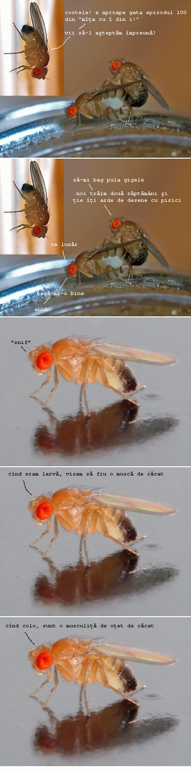 Ah, şi peste tot e plin de gângănii. Nici nu vreau să ştiu peste ce leviatani am să dau când m-oi băga pe sub pat să şterg praful. Până atunci o mică distracţie sezonieră cu binecunoscuta Drosophila melanogaster, musculiţa de oţet.