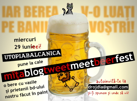 Pentru că Mîţa a împlinit doi ani noi ieşim să bem o bere într-un loc comod şi ieftin. Treaba va avea loc miercuri, pe 29 adică, după-amiaza şi seara şi până nu mai putem. Am trimis invitaţii unor Mîţfani pe care îi ascundeam eu într-o bază de date super secretă, iar dacă prin nu ştiu ce eroare teribilă n-ai primit nimic pe mail şi vrei să vii să bei o bere cu noi, cere şi tu invitaţia (unde scrie exact unde, când, date de contact şi aşa mai departe) la drojdia (a rond) gmail punct com.