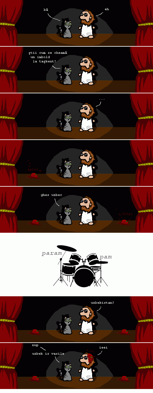 Până atunci (şi până rezolv nişte mizerii restante din cadrul tumultuoasei mele vieţi profesionale – adică până le mai amân niţel), iată această glumă foarte amuzantă la care am lucrat vreme de zece zile în vârful unei dune, ştiind că urmează să mă întorc şi vrând neapărat să mă întorc cu o glumă foarte amuzantă.