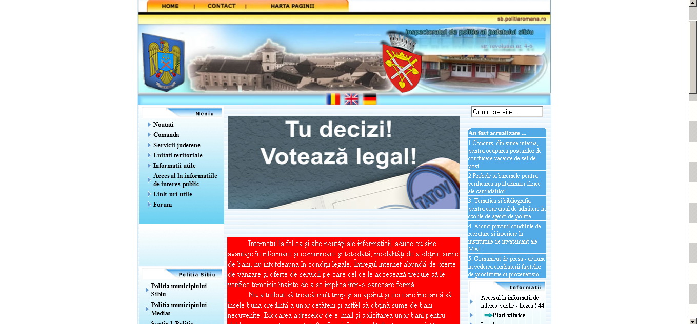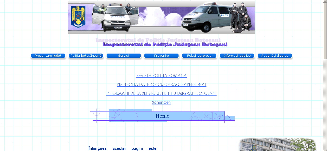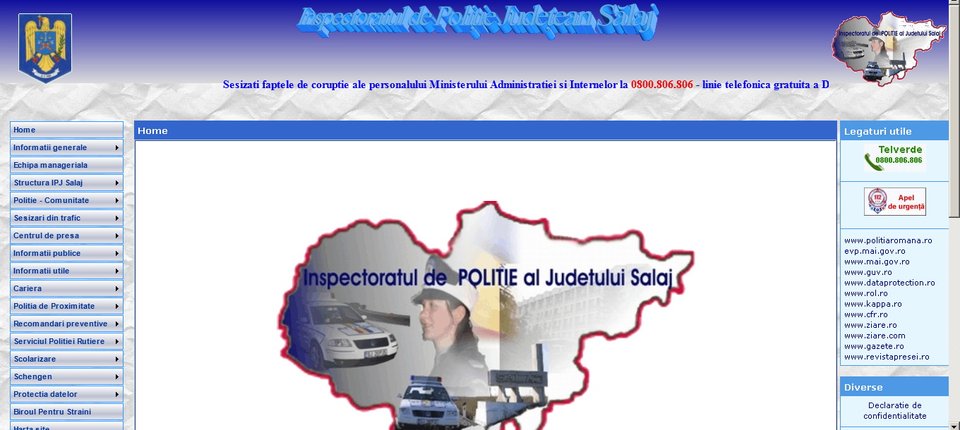 Când vorbim de un judeţ atât de bogat în iniţiative infracţionale pe fondul consumului de alcool, faptul că există un sait al Poliţiei e deja încununarea unui efort de veacuri. De aceea nu-i putem decât aplauda pe urmaşii lui Ştefan cel Mare că şi-au dat silinţa să facă şi stema să se învârtă. În plus, tot textul e de fapt imagini, ca să nu trebuiască pârjolit când vin turcii să-l ia cu cursorul ca să-l copieze în Notepad. Nu, serios, absolut tot textul e făcut din imagini.