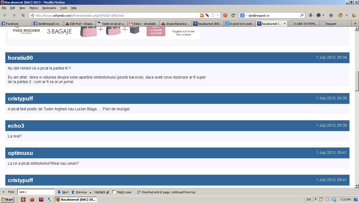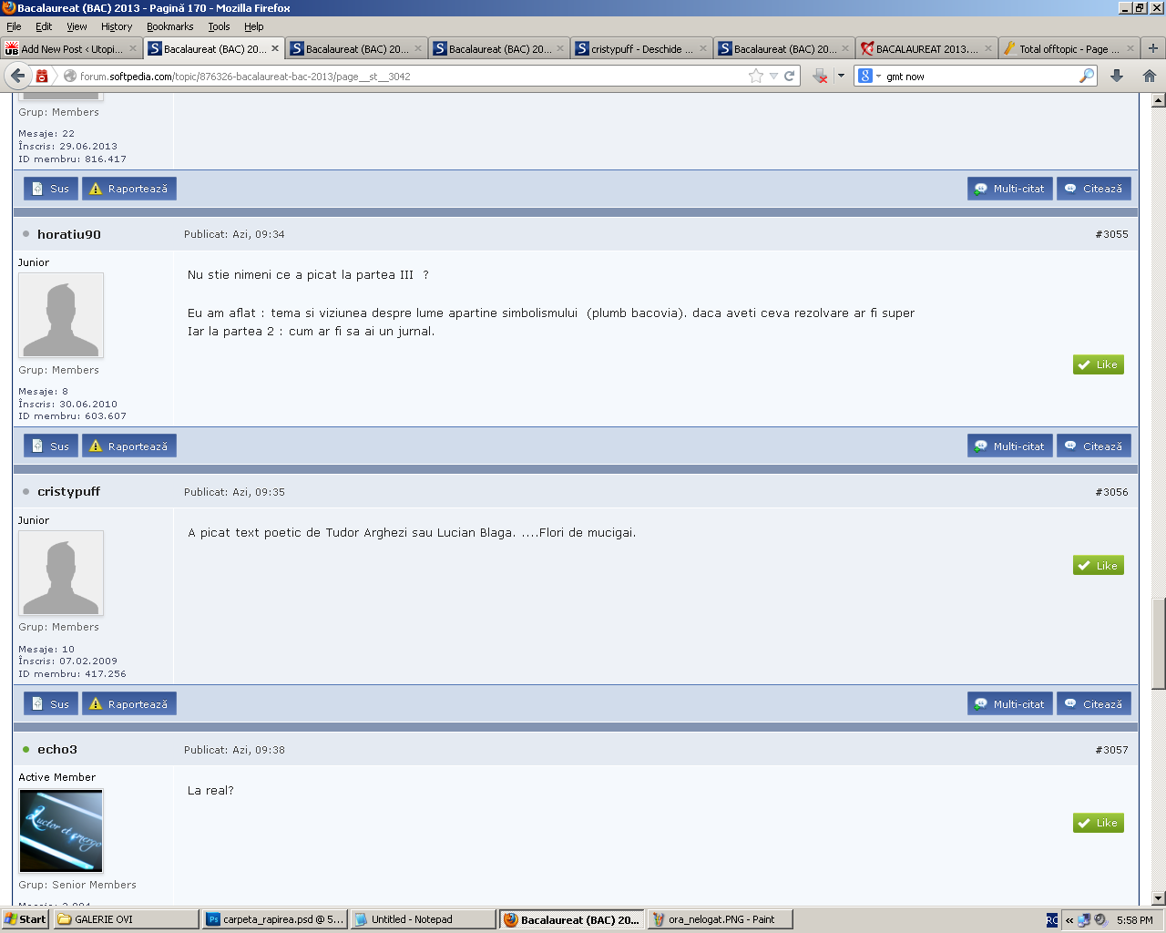 Deci, de fapt, nişte copii au discutat pe interneţ subiectele de la Bac la jumătate de oră după ce s-a desfăcut plicul. Asta nu mai face valuri. Adică pe mine, cel puţin, nu mă prea miră. Mai ales că am dat Bacul în 2007, înainte de “Funeriadă” dar după invenţia telefonului de fiţe.