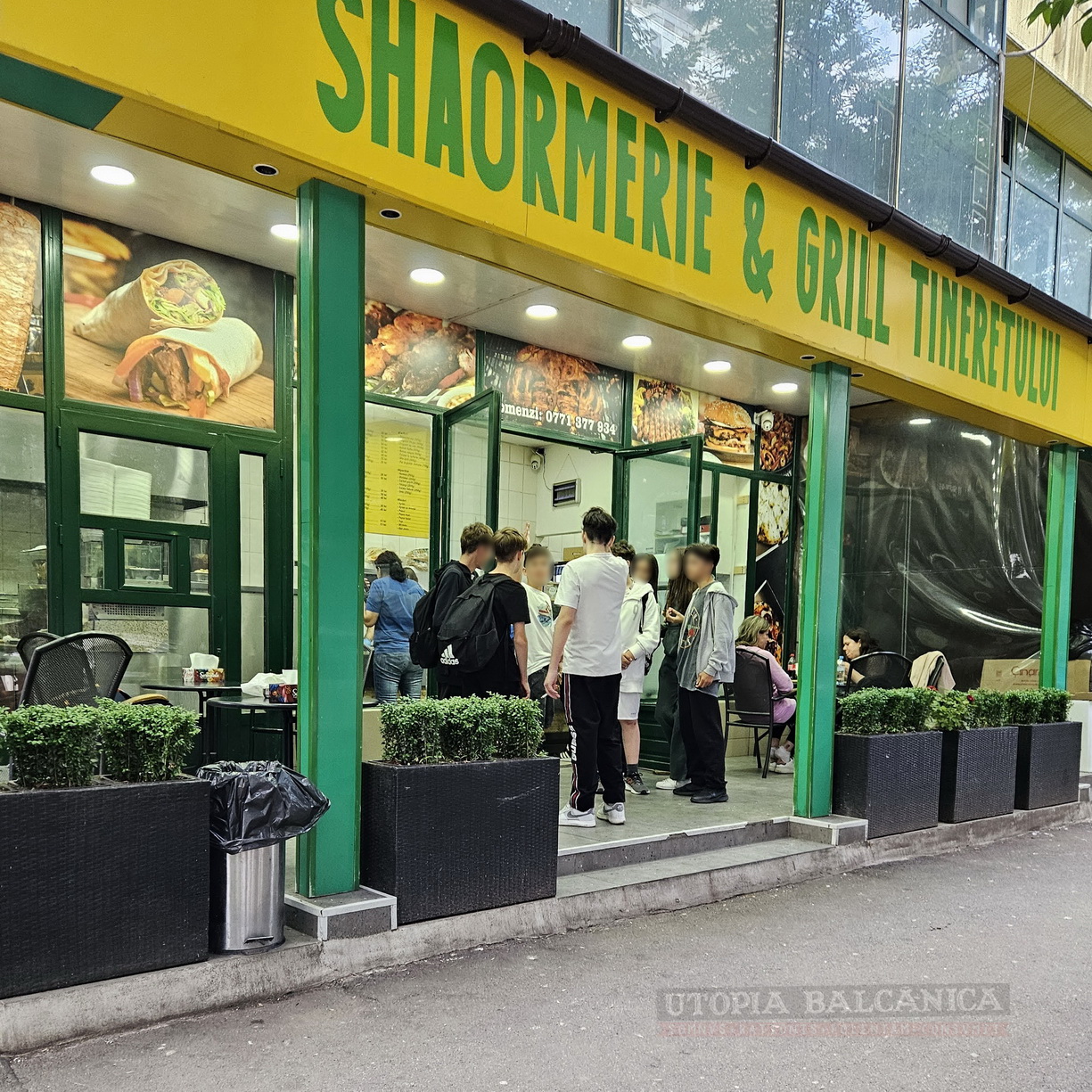 Şi mi-am amintit că mai mulţi cititori & prieteni mi-au recomandat să vizitez Shaormerie & Grill Tineretului. Am chemat un metrou până acolo, m-am strecurat printr-un gang unde mirosea a pipi ca în 1997, am aflat cum arată piaţa Norilor (deşi am trăit toată viaţa în jumatea asta de Bucureşti, habar n-aveam) şi am găsit şaormăria. Uite-o, acolo, în zare: e umbroasă, verde şi galbenă, ca Brazilia sau FC Vaslui odinioară. Alături are o măcelărie arăbească. De obicei ăsta-i semn bun.