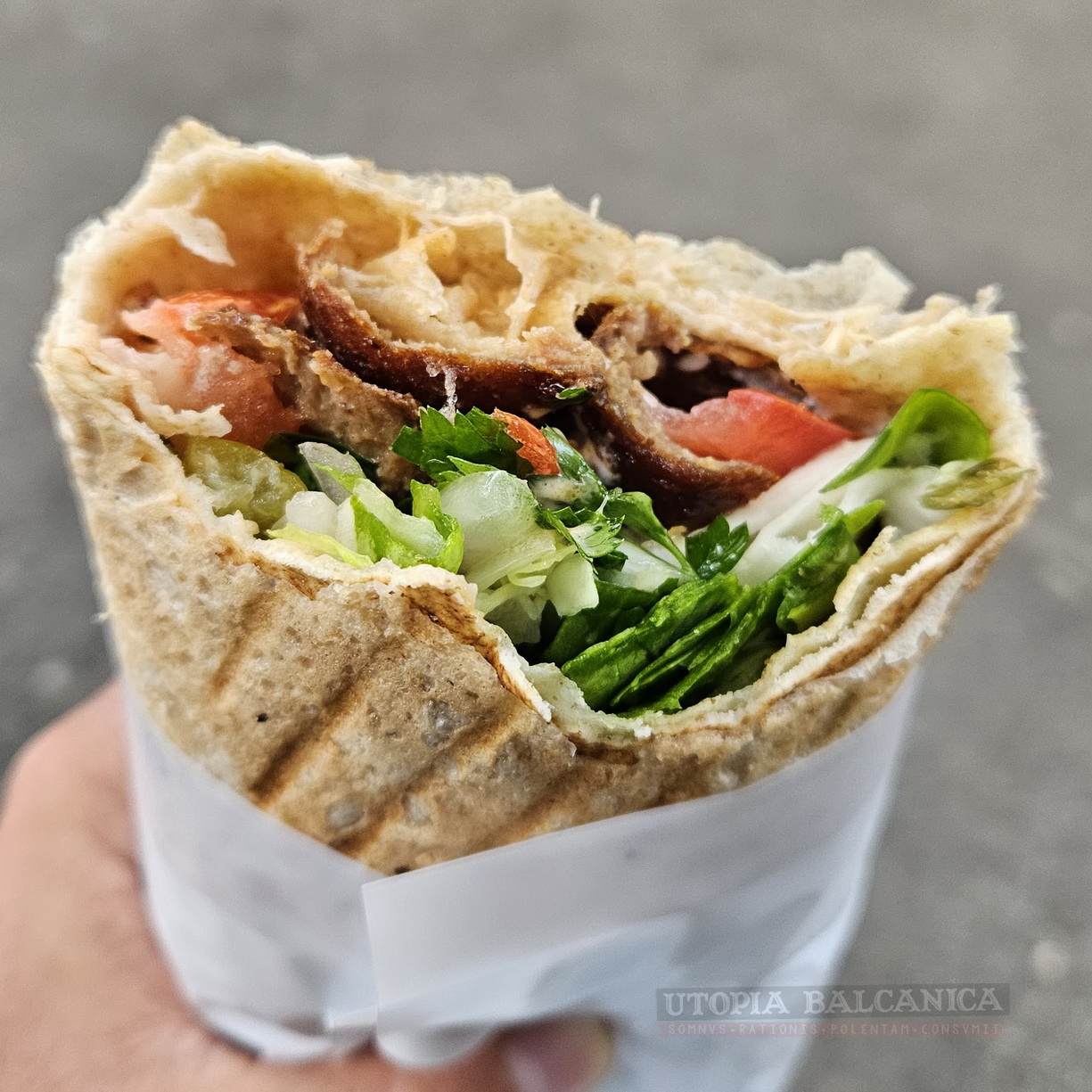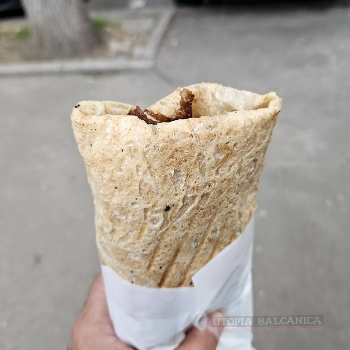 Pachetul finit se ţine în mână bine, se muşcă uşor, sosul e bine contenţionat. Înăuntru nu e spectacol, dar e armonie. Carnea e o tocătură condimentată corect, caramelizată perfect (deh, nu s-au atins copiii de ea, a avut timp), fragedă şi pufoasă ca o carne de mici (arăbeşti). Verdeaţa e proaspătă – salată, ceapă cu pătrunjel, varză, două roşii.