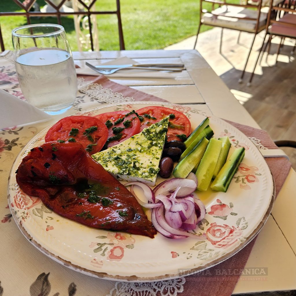 Roşii gustoase, un ardei copt excelent, un triunghi de sirene, măsline kalamata (acasă).