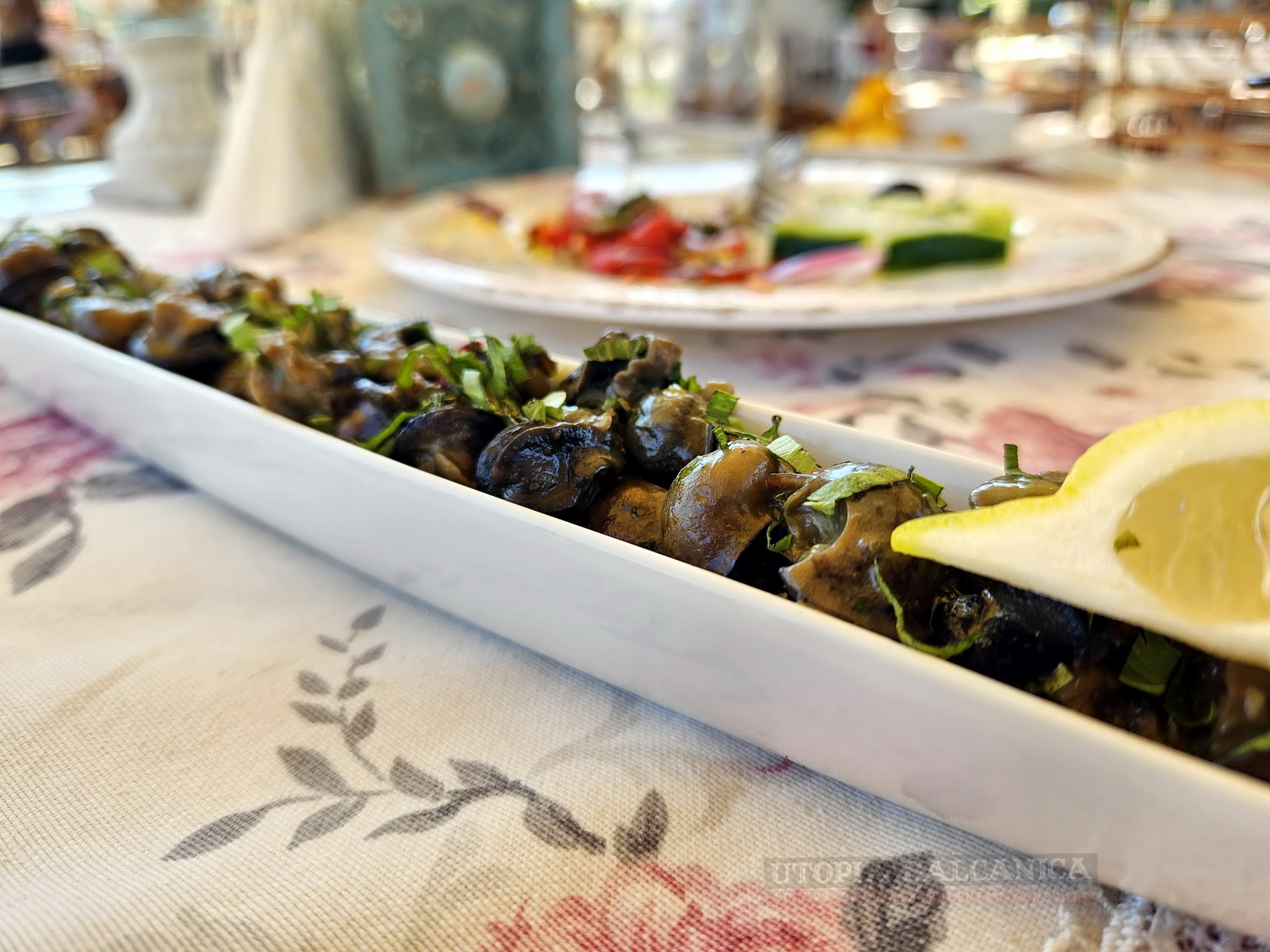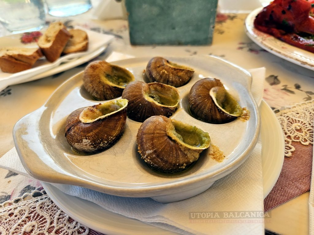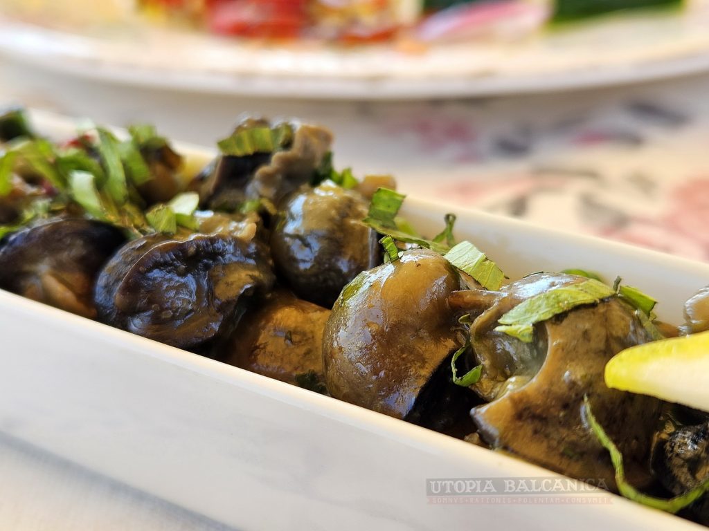 Ca midiile la Dalboka, dar într-un registru mai fancy-şmancy, moluştele mucilaginoase joacă aici în tot felul de piese trăsnite: mămăligă cu melci, paste cu melci, fondue cu melci, melci wellington, melci în pilaf. Scorurile sunt măricele pentru pustietatea în care ne aflăm, dar deloc tulburătoare pentru un restaurant cu melci.