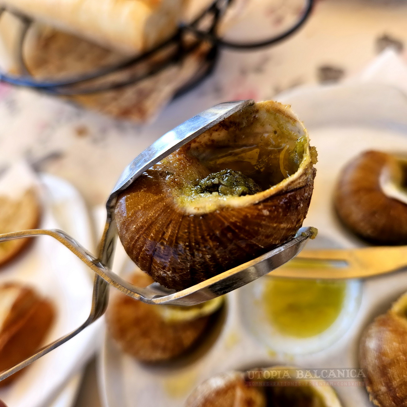 Am început cu absolut clasicii escargoţi în stil burgund, adică bolborosind în cochilie cu o căruţă de unt topit şi usturoi, gata să fie extraşi cu furculiţa specială de melc. Ţi-am zis că am fost conservator şi am lăsat kaceamakul pentru altă vizită.