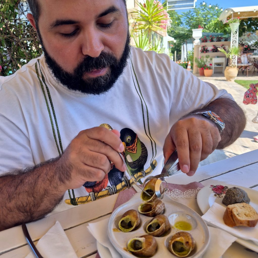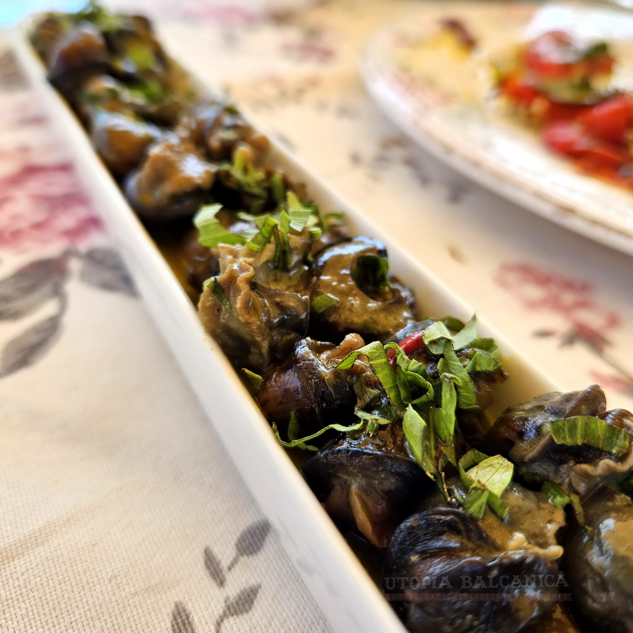 Dacă n-ai mâncat niciodată melci de grădină dar ai mâncat rapane prin 2 Mai, să ştii că arată similar dar sunt din altă poveste. Textura lor e undeva între scoică şi pipotă de pui tânăr, şi nu te lovesc cu dulce şi umami ca vietăţile marine – doar cu o adiere feroasă, ca şi când ai gusta ficat dar de la distanţă.