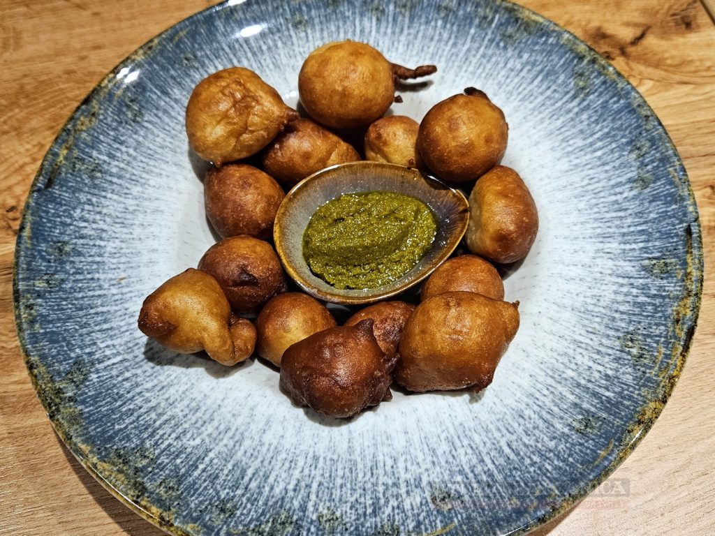 Gogoşelele vin însoţite de un sos verde – un soi de pesto de pătrunjel – şi unul roşu, un pic spicy, un pic usturoiat, amintind a zacuscă.