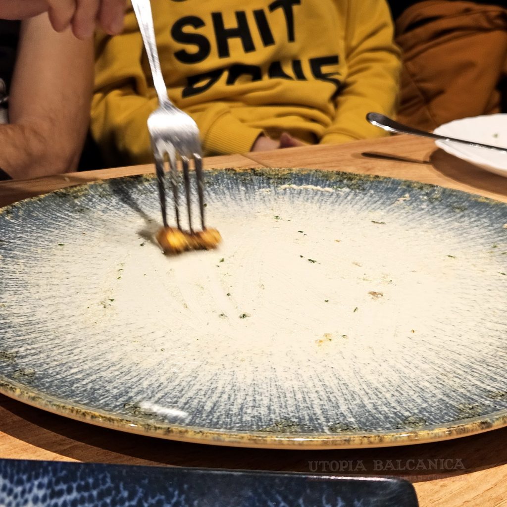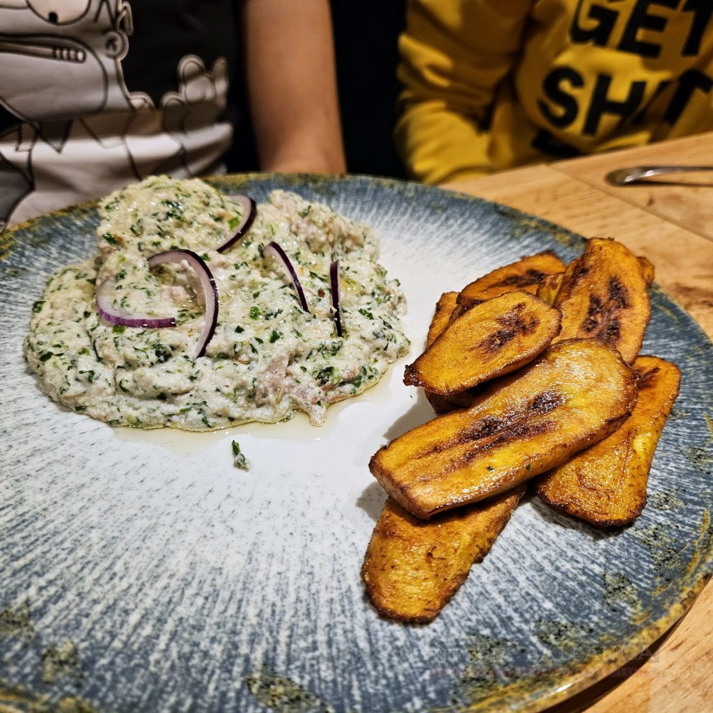 Se “întinge” în terciul ambiguu şi delicios cu fufu, mămăliga africană, care poate fi făcută din tot felul de amidoane, dar azi pare de griş. Nu-i deloc ieftină combinaţia (85 de lei), nici porţia nu-i monstruoasă, dar hei, e egusi cu fufu ca la maică-sa acasă. Avem Golful Guineei în Baicului.