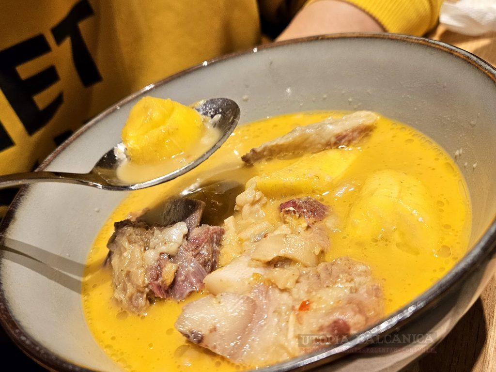 Tot carne de vită onctuoasă şi fâşii gumoase de burtă am găsit, printre bucăţoaiele de banană ne-dulce, în ce mi s-a părut mie vedeta serii, aşa-numita pepper soup (79 de lei). O zeamă iute, potentă – şi în acelaşi timp uşurică şi atât de familiară, având în comun cu ciorba noastră de burtă parfumul pământos şi belşugul de colagen.